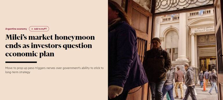 El periódico Financial Times difundió este domingo un artículo sobre los desafíos que enfrenta Javier Milei a siete meses de su asunción. En el marco de lo que el Gobierno definió como la segunda etapa del plan de estabilización, la publicación británica consideró que “se termina la luna de miel” del Presidente con los mercados. “Los inversores cuestionan el plan económico”, tituló el diario.